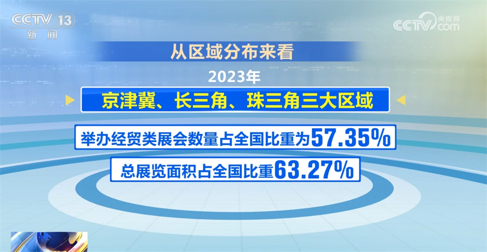 從區(qū)域分布來看,2023年京津冀、長三角、珠三角三大區(qū)域舉辦經(jīng)貿(mào)類展會(huì)數(shù)量占全國比重為57.35%,總展覽面積占全國比重63.27%。
