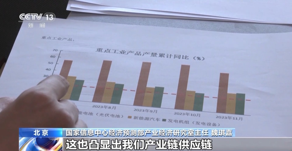 國(guó)家信息中心經(jīng)濟(jì)預(yù)測(cè)部產(chǎn)業(yè)經(jīng)濟(jì)研究室主任 魏琪嘉:像這樣的產(chǎn)品實(shí)現(xiàn)了兩位數(shù)的增長(zhǎng)的這種態(tài)勢(shì),其實(shí)對(duì)于一個(gè)經(jīng)濟(jì)體來講是實(shí)屬不易的。這也凸顯出我們產(chǎn)業(yè)鏈供應(yīng)鏈配套能力的大幅提升。產(chǎn)品背后蘊(yùn)含的是技術(shù)、要素的優(yōu)化組合,催生出新的生產(chǎn)能力,其實(shí)也是我們經(jīng)濟(jì)發(fā)展中的這種亮點(diǎn)。