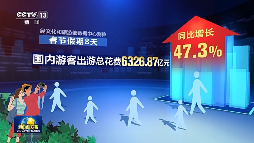 今年這個(gè)春節(jié),人們走得更遠(yuǎn),游玩時(shí)間更長(zhǎng)。出行平臺(tái)分析訂單數(shù)據(jù)后發(fā)現(xiàn),假期里,超過一半的人選擇跨省出游,其中三成以上的人選擇兩個(gè)及以上目的地,中國游客出境目的地覆蓋全球1700多個(gè)城市,個(gè)性化出游、定制化消費(fèi)成為新趨勢(shì)。在陜西景區(qū)里看一場(chǎng)沉浸式演出,游客既是觀眾,又是演員,全新消費(fèi)體驗(yàn)帶來上億元演出收入;四川把火鍋文化和特色觀光結(jié)合在一起,帶動(dòng)特色餐飲消費(fèi)熱度不斷。節(jié)日里,滕王閣景區(qū)北園向公眾開放,通過濱江水道,游客可以直接穿行老城區(qū)的商鋪。經(jīng)文化和旅游部數(shù)據(jù)中心測(cè)算,春節(jié)假期八天,全國國內(nèi)旅游出游4.74億人次,同比增長(zhǎng)34.3%,國內(nèi)游客出游總花費(fèi)6326.87億元,同比增長(zhǎng)47.3%。
