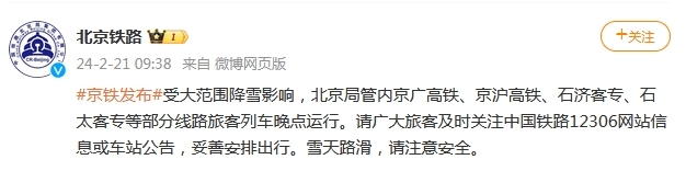 中新網(wǎng)2月21日電 據(jù)中國(guó)鐵路北京局集團(tuán)有限公司官方微博消息,受大范圍降雪影響,北京局管內(nèi)京廣高鐵、京滬高鐵、石濟(jì)客專(zhuān)、石太客專(zhuān)等部分線路旅客列車(chē)晚點(diǎn)運(yùn)行。