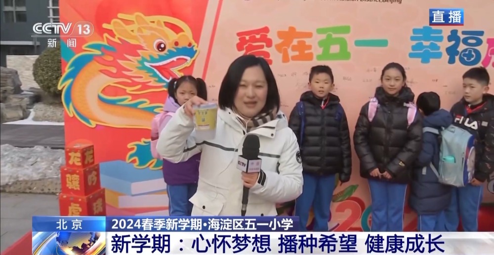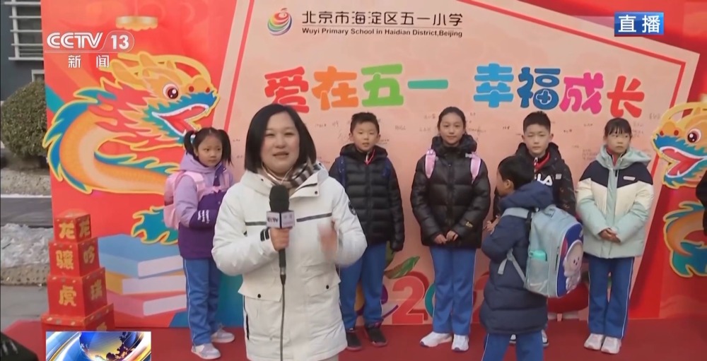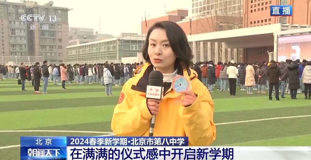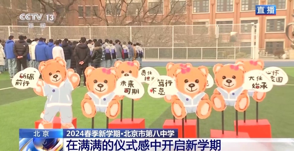 總臺央視記者 李晶晶:北京市第八中學高中部,近2300名高中生齊聚國旗下,舉行新學期的第一次升旗儀式,在滿滿的儀式感中開啟新的學習生活。今年是龍年,有句祝福語叫“龍行龘龘,前程朤朤”,現在正在進行的國旗下的演講,題目就是《龘龘朤朤間是向上的力量》,老師祝福學生們像龍一樣騰飛而上,同時也是鼓勵他們要有夢想,為實現夢想不斷努力向上。
