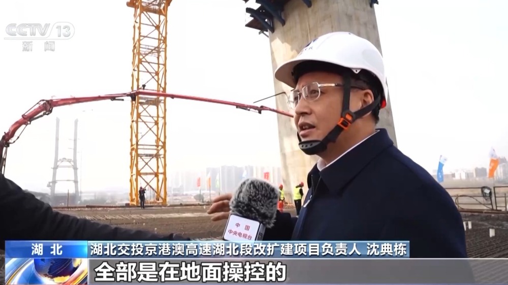 湖北交投京港澳高速湖北段改擴(kuò)建項(xiàng)目負(fù)責(zé)人 沈典棟:這個(gè)塔頂上就是輕型智能筑塔機(jī),是采用智能建造的技術(shù),全都是在地面操控的,塔上無人,這樣就保證了我們工人安全。我們這個(gè)智能的布料系統(tǒng),布料很均勻,讓混凝土不產(chǎn)生離析。