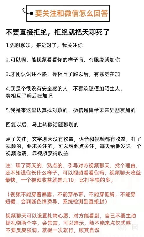 記者注意到,“使用手冊(cè)”第一頁(yè)聲明中稱,只參與軟件推廣,不涉及套路教學(xué)、虛假聊天、誘導(dǎo)充值。當(dāng)記者對(duì)是否能賺到錢表示擔(dān)憂時(shí),該推廣員發(fā)來(lái)一份“社交聊天日入千元攻略”,包含怎樣設(shè)置頭像、如何引導(dǎo)對(duì)方視頻聊天、如何拒加微信等信息。