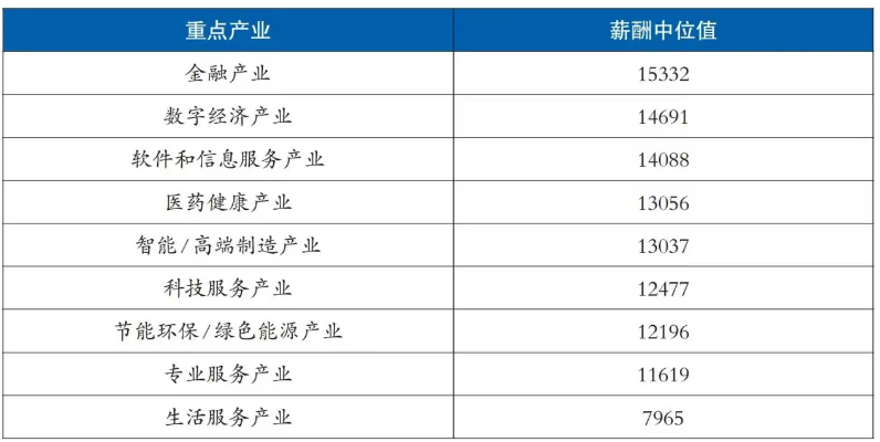 2024年第一季度,重點產業(yè)中金融、數字經濟、軟件和信息服務業(yè)薪酬中位值位居前三,分別為 15332 元、14691 元、14088 元,生活服務產業(yè)薪酬中位值為7965元,漲幅較為突出。