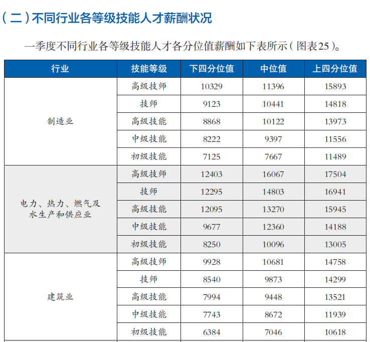 一季度部分行業(yè)各等級技能人才薪酬分位值(單位:元/月)(圖源:北京市人力資源和社會保障局官方網站截圖)