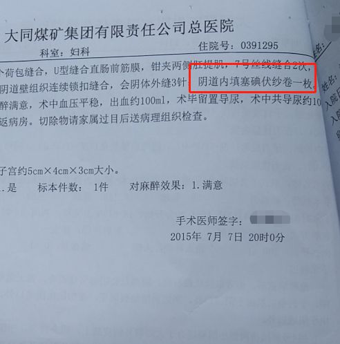 2015年7月,譚先生的母親曾在同煤集團總醫(yī)院婦科做手術。他提供的一份落款日期為2015年7月7日的手術記錄顯示,其母在大同市煤礦集團有限責任公司總醫(yī)院婦科做了“下行陰式子宮切除術+陰道前后壁修補術+尿道折疊術+盆腔粘連松解術”,縫合之后在“陰道內填塞碘伏卷紗一枚”。