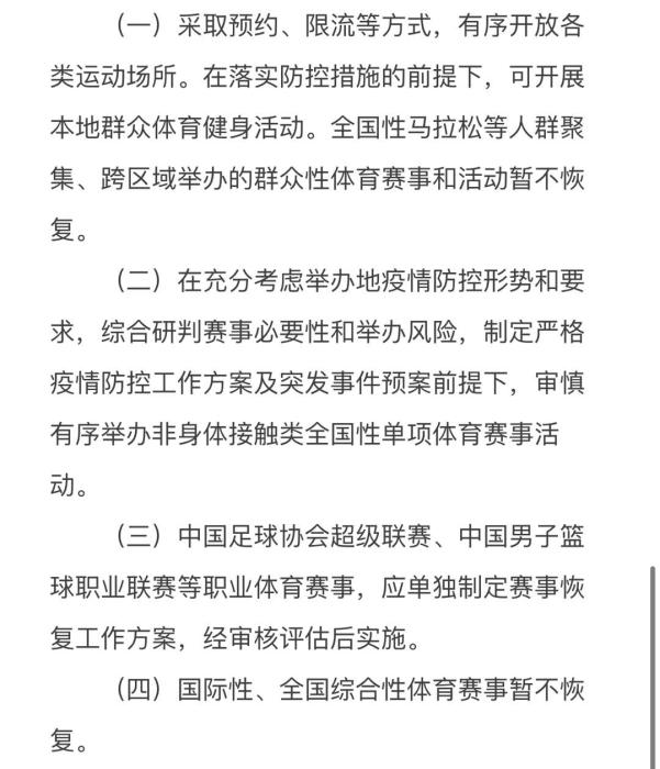 體育總局:中超、CBA等應(yīng)單獨制定賽事恢復(fù)工作方案