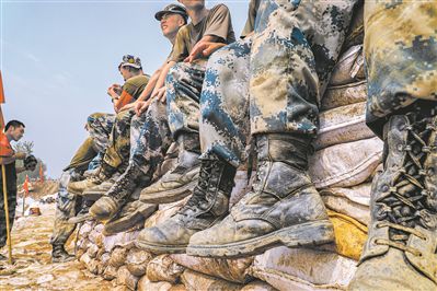 7月20日,在筑壩固堤任務(wù)中,年輕官兵們的戰(zhàn)靴沾滿泥土。謝程宇 攝