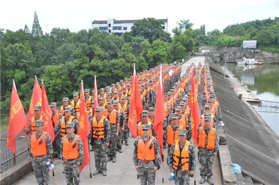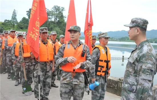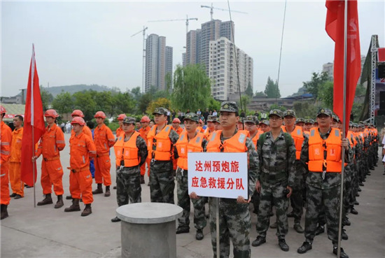 下午15時(shí),大竹縣烏木水庫(kù)大堤上,200余名預(yù)備役官兵身著橘色救生衣集結(jié)完畢,應(yīng)急分隊(duì)的紅旗迎風(fēng)招展,機(jī)關(guān)各科協(xié)調(diào)的保障力量也源源不斷往集結(jié)地域開進(jìn)。15時(shí)20分,應(yīng)急分隊(duì)已到達(dá)指定地域,救援物資全部到位。