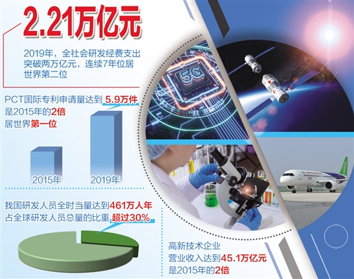 科技創(chuàng)新實(shí)力顯著增強(qiáng)。2019年,全社會(huì)研發(fā)經(jīng)費(fèi)支出達(dá)到2.21萬億元,是2015年的1.56倍,連續(xù)7年位居世界第二位,占全球研發(fā)經(jīng)費(fèi)總量的比例超過16%。2019年,PCT國際專利申請量達(dá)到5.9萬件,是2015年的2倍,躍居世界第一位。2019年,每萬人有效發(fā)明專利擁有量達(dá)到13.3件,提前完成國家“十三五”規(guī)劃目標(biāo)。