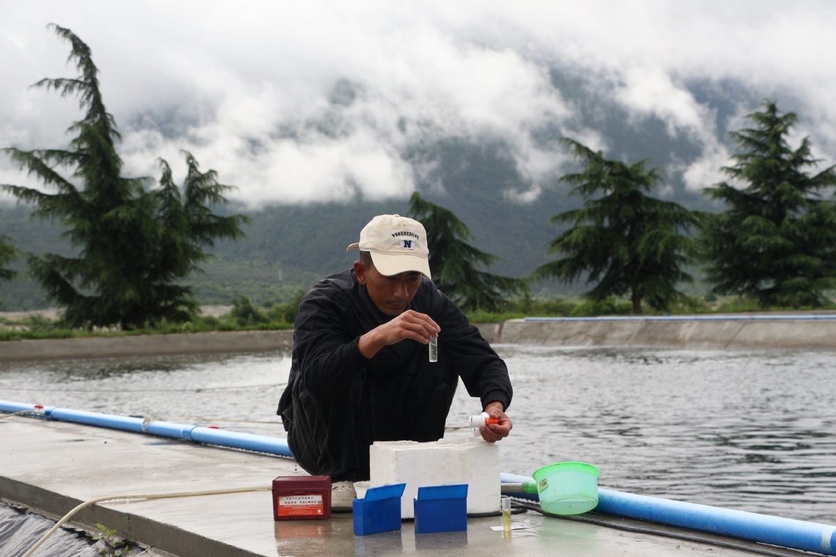 尼瑪旺堆在撒料、測(cè)水質(zhì)。