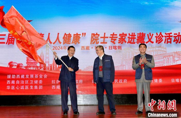 圖為第三屆“西藏人人健康”院士專家進藏義診活動啟動儀式上,西藏自治區(qū)副主席甲熱·洛桑丹增(圖左)為義診專家團隊代表授旗。李林 攝