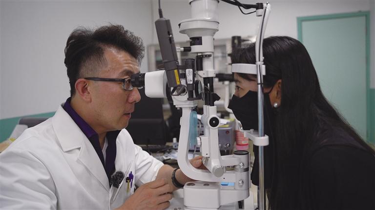 天津市第十批援藏干部、昌都市藏醫(yī)院眼科副主任醫(yī)師步紹翀開(kāi)展眼科檢查。記者 貢曲羅杰 鄭常容