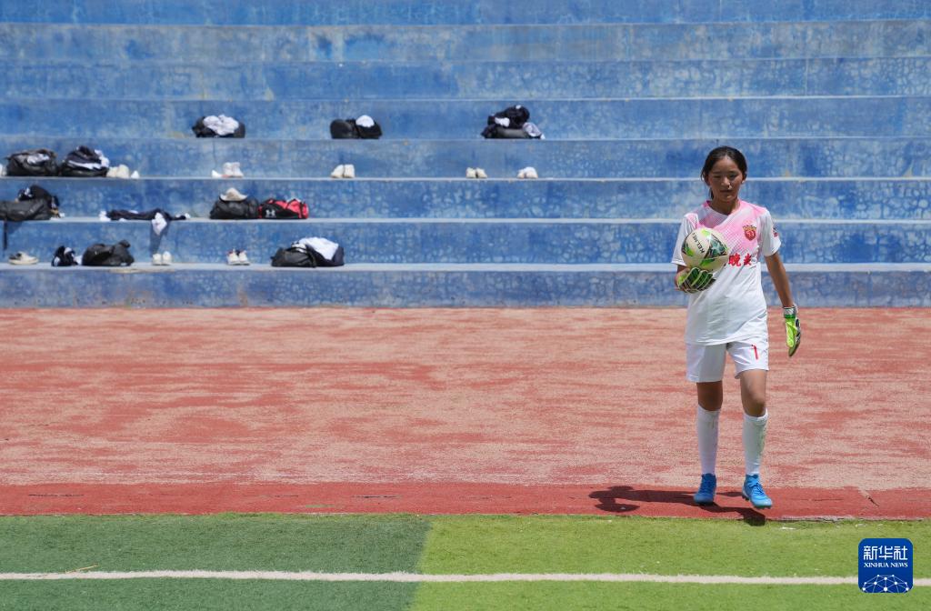 在西藏日喀則市上海實(shí)驗(yàn)學(xué)校,“珠峰雪鷹”女子足球隊(duì)守門員邊普在操場(chǎng)上訓(xùn)練(9月3日攝)。
