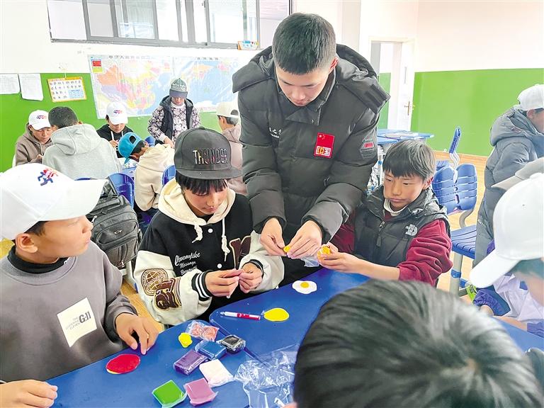 圖為支教隊(duì)員余梓鑫和孩子們一起完成課堂小游戲。