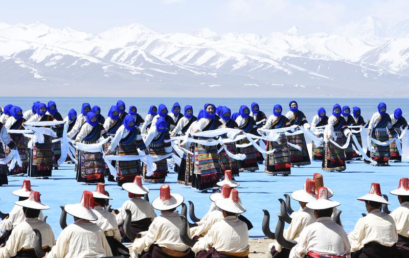 5月19日,在距拉薩市區(qū)240公里、海拔4718米的納木措湖邊,一場(chǎng)盛大的“開湖日”活動(dòng),將西藏“圣湖”納木措的美展現(xiàn)在國(guó)內(nèi)外約200名賓客眼前。圖為舞蹈演員在納木錯(cuò)開湖活動(dòng)現(xiàn)場(chǎng)表演。記者 旦增蘭澤 攝