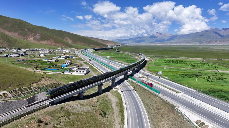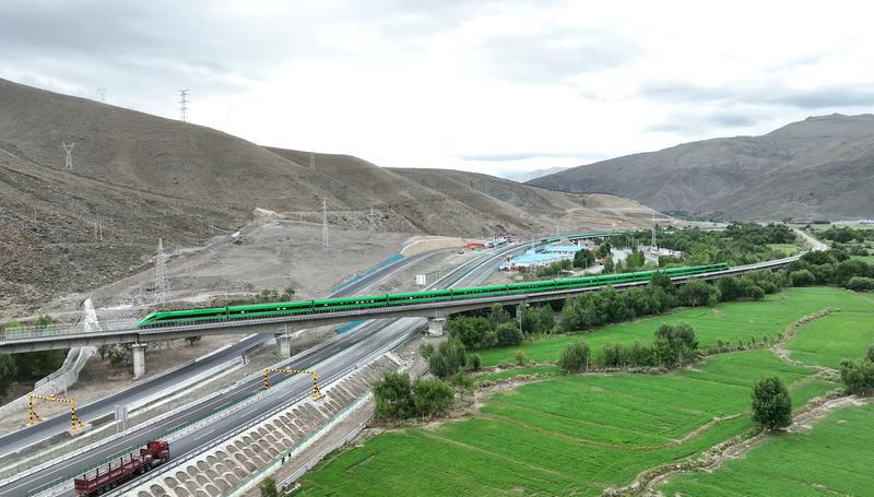 6月30日,G4218雅安至葉城國(guó)家高速公路拉薩至日喀則機(jī)場(chǎng)段項(xiàng)目建成通車。圖為318國(guó)道 、拉日鐵路 、拉日高等級(jí)公路 交錯(cuò)并行。記者 索朗群培 次旦央吉 扎西頓珠