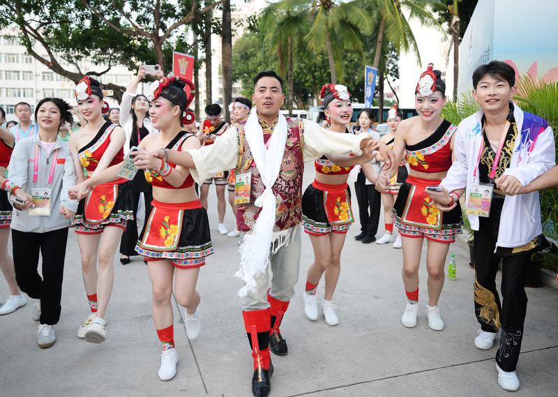 11月22日,由國(guó)家民委和國(guó)家體育總局主辦、海南省人民政府承辦的第十二屆全國(guó)少數(shù)民族傳統(tǒng)體育運(yùn)動(dòng)會(huì)在海南三亞開幕。圖為第十二屆全國(guó)少數(shù)民族傳統(tǒng)體育運(yùn)動(dòng)會(huì)西藏代表團(tuán)民族健身操運(yùn)動(dòng)員賽后與福建代表團(tuán)運(yùn)動(dòng)員一起跳鍋莊。