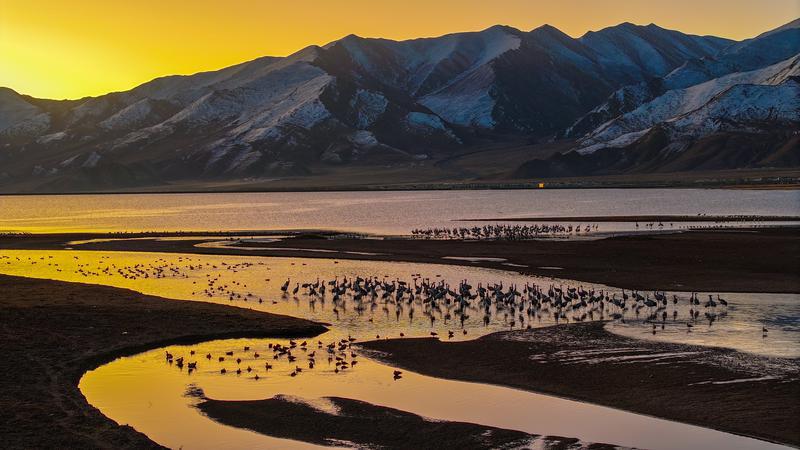 11月14日,拉薩市林周縣虎頭山水庫(kù)旁,一群黑頸鶴正悠閑的曬著太陽。晉巴次成 攝