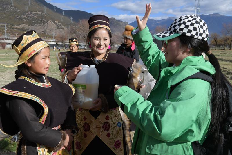 圖為林芝市巴宜區(qū)麥巴村村民正在向游客敬酒。索朗旺久 攝