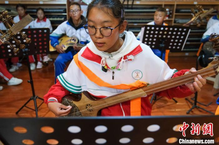 2024年9月9日,西藏山南浪卡子縣中學初二年級學生白瑪卓嘎學習彈六弦琴?!≈行律缬浾?江飛波 攝