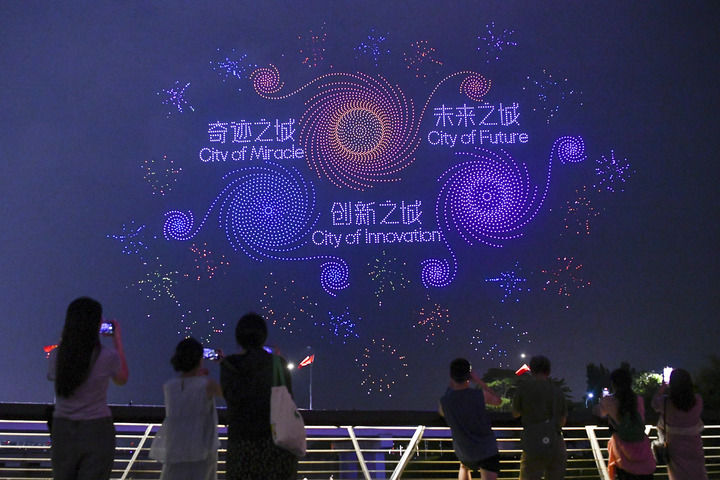 2024年9月26日,市民、游客在深圳灣觀看廣東深圳大漠大智控技術(shù)有限公司呈現(xiàn)的無(wú)人機(jī)編隊(duì)表演。新華社記者 梁旭 攝