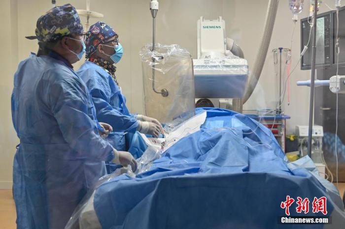 圖為2020年12月22日,西藏林芝市人民醫(yī)院的介入手術室里,心內科醫(yī)生普布扎西(左二)為一名冠心病患者進行冠狀動脈造影及支架植入術。 中新社記者 陳驥旻 攝