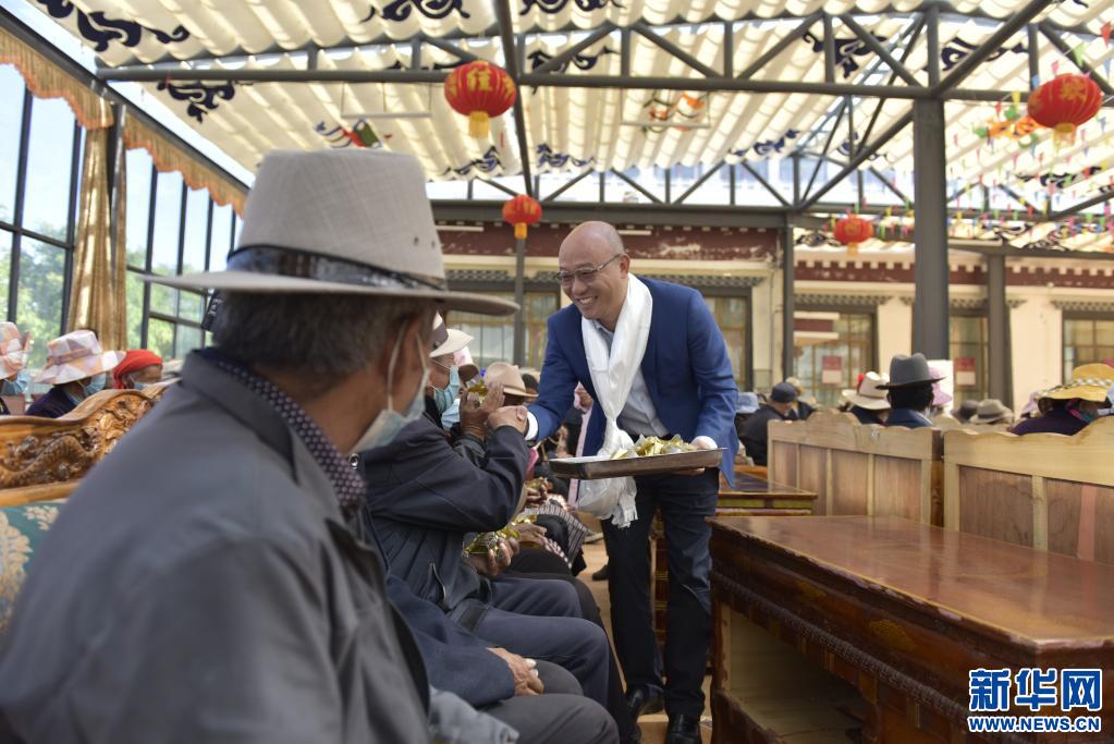 在西藏山南市乃東區(qū)特困人員集中供養(yǎng)服務中心,工作人員正在為孤寡老人們分發(fā)粽子。(新華社記者 格桑朗杰 攝)