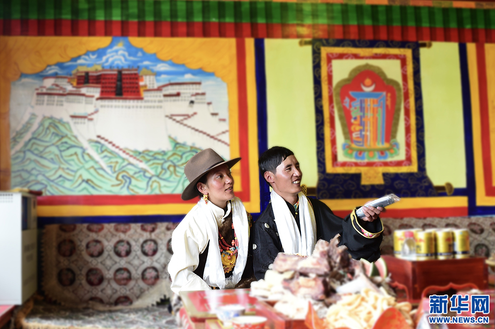 9月12日,村民堅(jiān)參羅布(右)和妻子在看電視。新華網(wǎng) 旦增努布攝