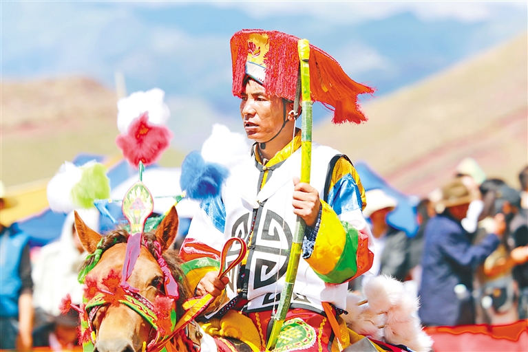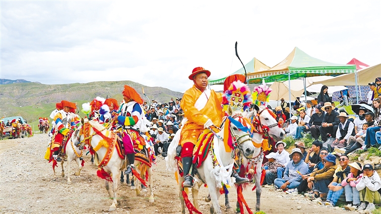 在邊交林鄉(xiāng)當(dāng)杰村“望果節(jié)”活動現(xiàn)場,隨著激昂的《運動員進行曲》,當(dāng)杰村“平措林望果節(jié)”活動拉開帷幕,38名馬術(shù)運動員、38名射箭運動員在2萬多名觀眾的歡呼聲中邁入現(xiàn)場。