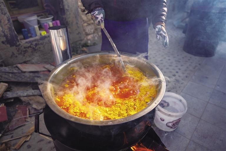 從金黃到色彩斑斕,“羅薩梅朵”的制作需要經過收割、曬干、上色等數(shù)道工序,這是桑木村村民傳承至今的手藝。熱氣騰騰的顏料鍋旁,年輕的媳婦正在煮顏料;曬干的“羅薩梅朵”堆在一旁,一位奶奶和她的孫子正在有序捆綁。廣場上,年齡最大的村民近70歲,最小的12歲,年輕人從老一輩手中接過了文化傳承的接力棒。