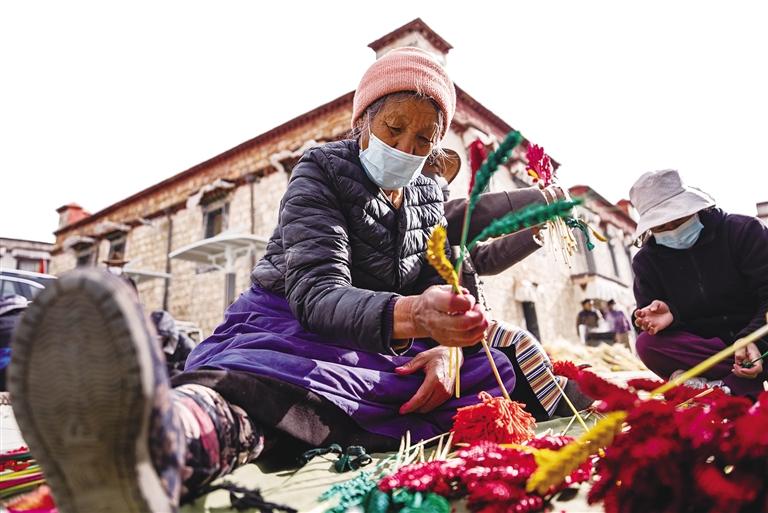 以前,高原植被稀疏,冬日里鮮花更是罕見。人們制作“羅薩梅朵”,讓這一束束“人造的花朵”盛開在冬日的高原上,這體現(xiàn)了西藏群眾對美好生活的熱愛和追求。正如央金所說,隨著西藏群眾物質生活水平的提高,色彩越來越鮮艷、品質越來越高的“羅薩梅朵”,正是西藏群眾多姿多彩幸福生活的絕佳體現(xiàn)。