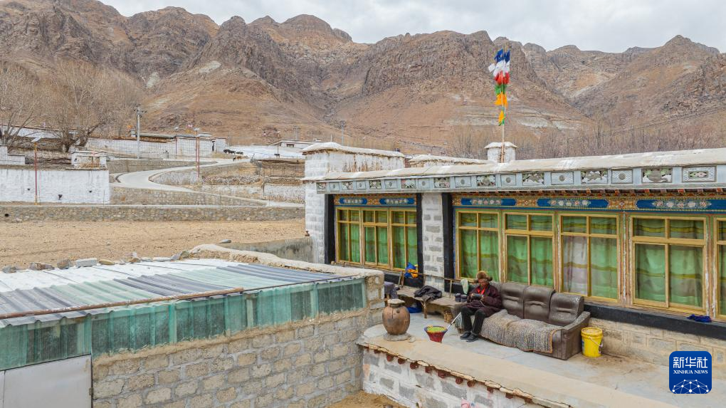 索扎老人在自家院子里聽收音機(3月20日攝,無人機照片)。新華社記者 丁增尼達 攝