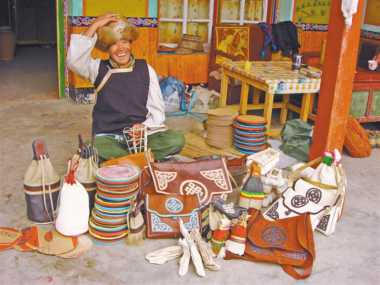 手藝人展示縣級非物質(zhì)文化遺產(chǎn)俊巴皮雕作品 。