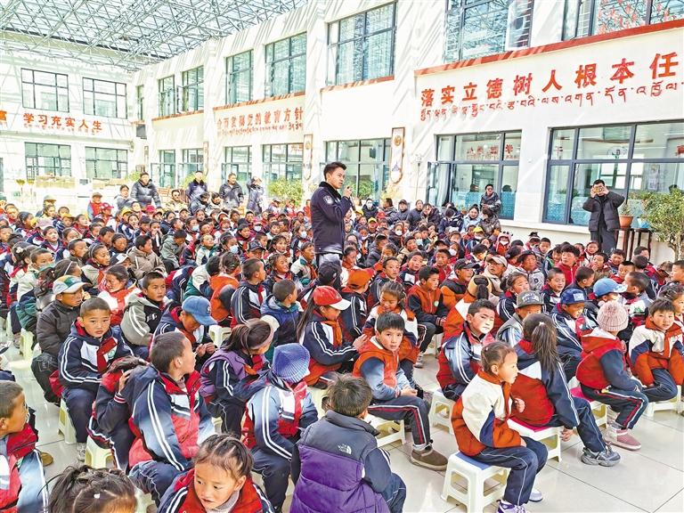 “辦理邊境通行證需要哪些材料?”“遭遇家暴、校園霸凌該怎么求助?”在堆納鄉(xiāng)中心小學的法治課堂上,民警澤成朗加正為孩子們講解未成年人保護法。這是該所“八五”普法宣傳的生動一幕。