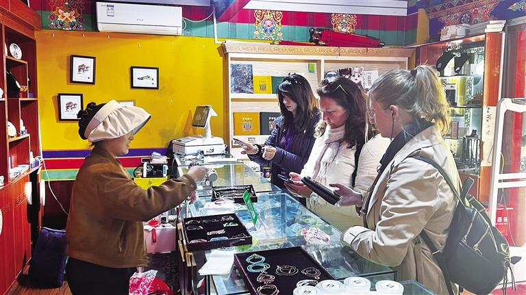 國(guó)際旅行商在文創(chuàng)店內(nèi)購(gòu)買(mǎi)紀(jì)念品。