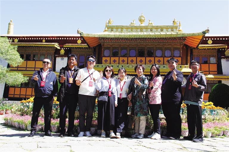 港澳地區(qū)旅行商在羅布林卡內(nèi)拍照留念。文/圖 記者 張琳