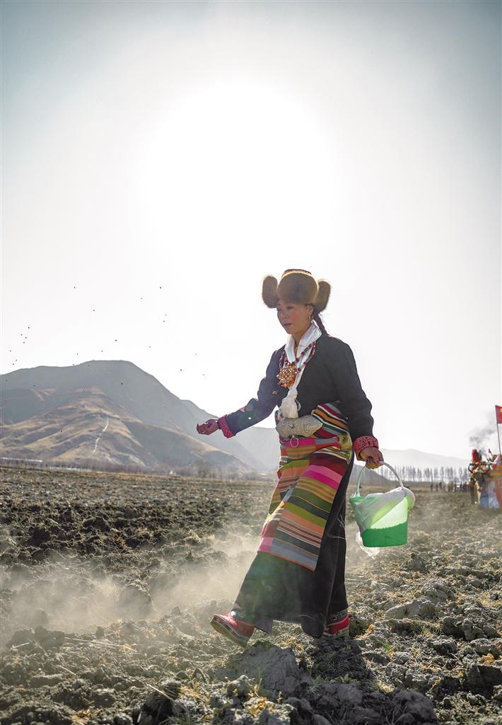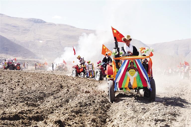 在克松村的田地旁,村民將拖拉機(jī)裝扮成“鐵?!保貌貞蛎婢?、彩色瓔珞等“打扮”一番,插著彩旗格外好看。村民還獻(xiàn)上哈達(dá)與自家釀的青稞酒給犁手、撒種子的姑娘和“鐵牛”,就開始了新春第一犁。
