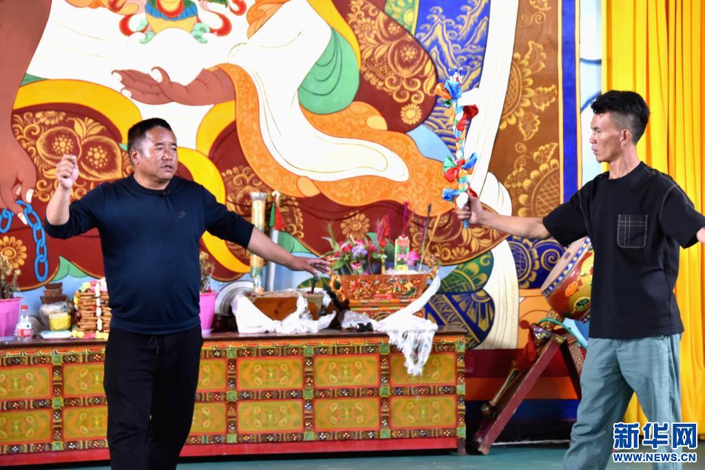 扎西曲登社區(qū)居委會主任尼瑪次仁(左一)指導年輕人排練藏戲(2021年7月15日攝)。新華社記者陳尚才 攝
