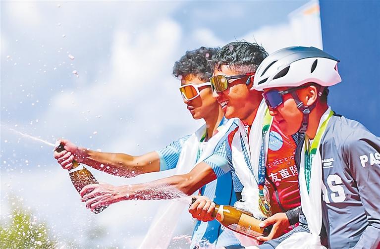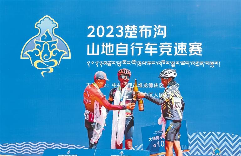 2023年堆龍德慶區(qū)宇妥文化旅游演出季·楚布溝山地自行車競速賽頒獎典禮上,選手在慶祝獲獎。