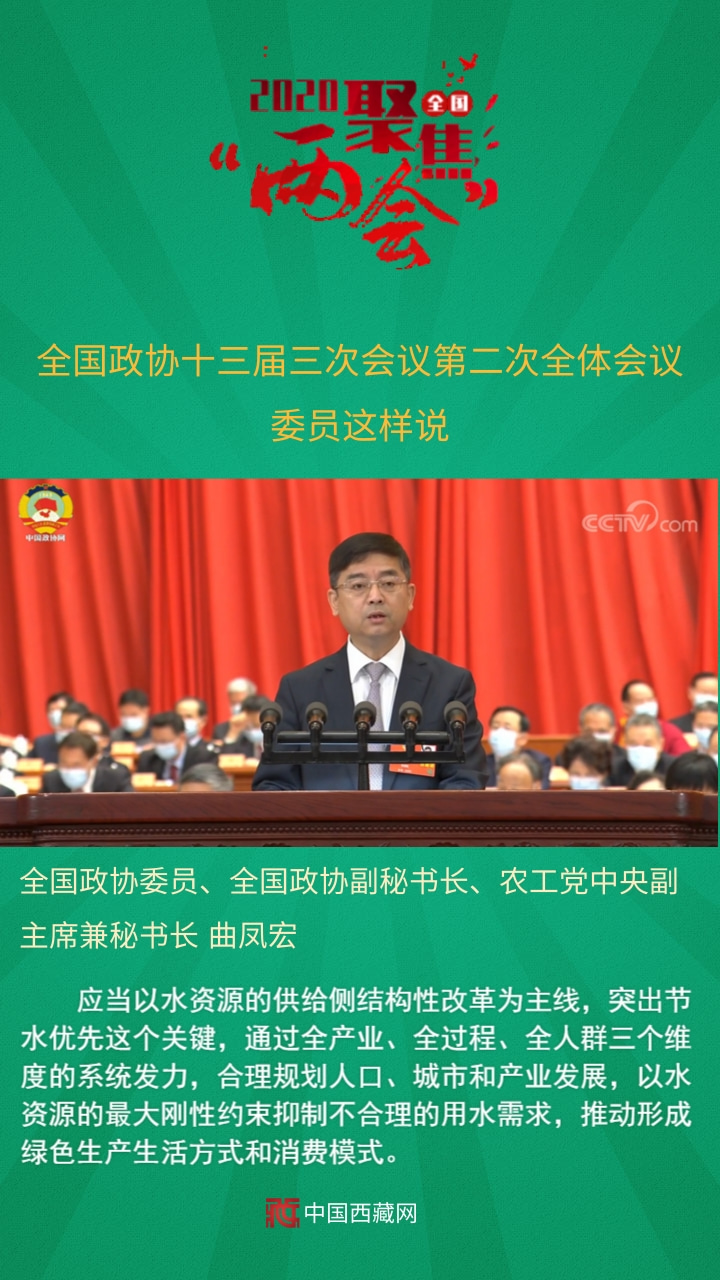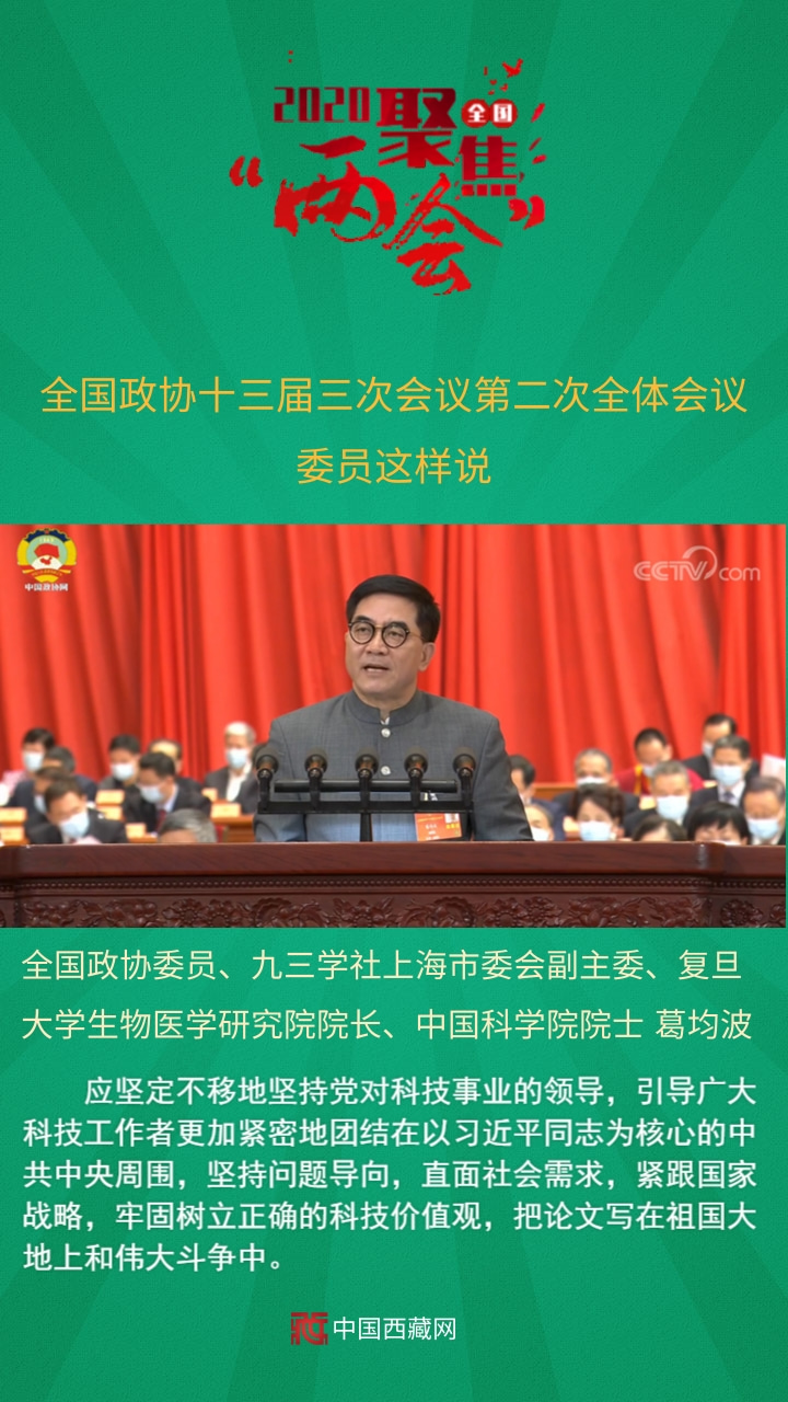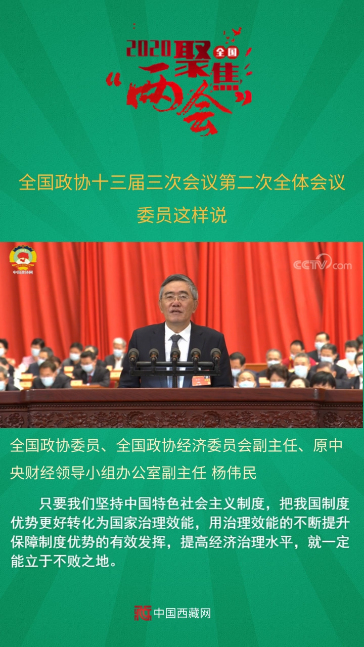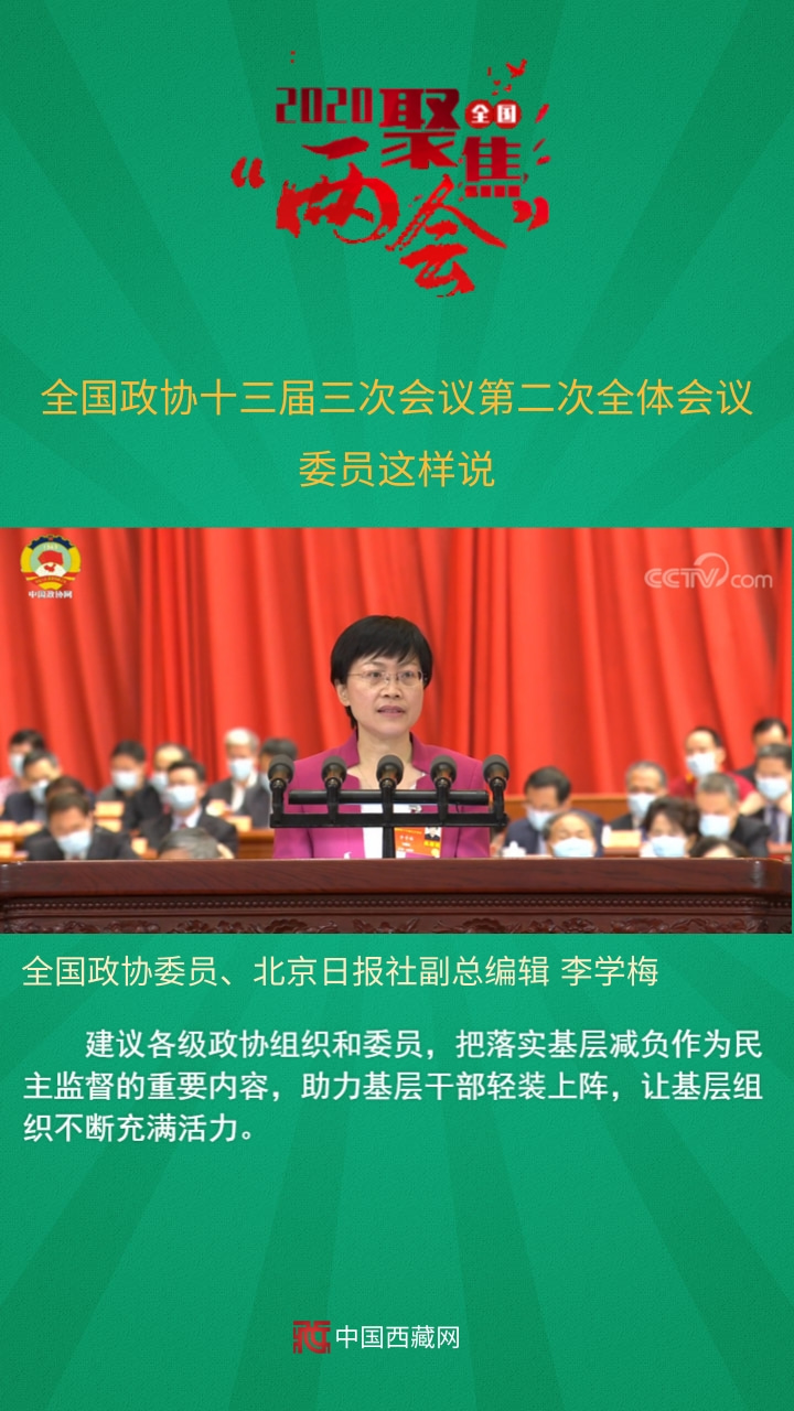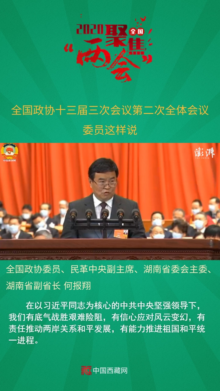 中國西藏網(wǎng)訊 全國政協(xié)十三屆三次會(huì)議第二次全體會(huì)議5月24日上午在人民大會(huì)堂舉行。12名委員分別圍繞“脫貧攻堅(jiān)”“武漢戰(zhàn)‘疫’”“經(jīng)濟(jì)建設(shè)”“六穩(wěn)六?!薄盎鶎訙p負(fù)”等主題作大會(huì)發(fā)言。中共中央政治局委員、國務(wù)院副總理孫春蘭,中共中央政治局委員、中央書記處書記、中央宣傳部部長黃坤明以及中共中央、國務(wù)院有關(guān)部門的負(fù)責(zé)同志,應(yīng)邀出席會(huì)議,聽取委員們的意見建議。