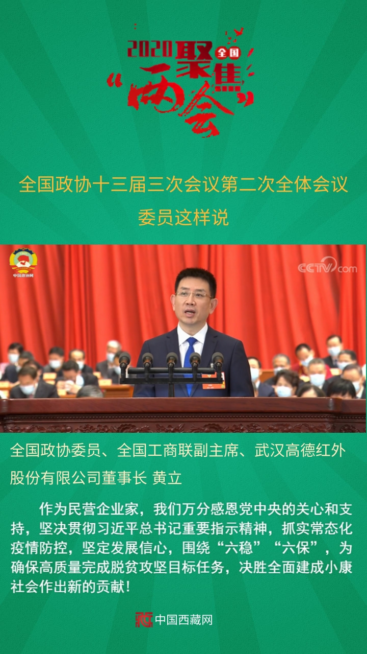 全國政協(xié)委員、全國工商聯(lián)副主席、武漢高德紅外股份有限公司董事長黃立發(fā)言說,作為民營企業(yè)家,我們?nèi)f分感恩黨中央的關(guān)心和支持,堅(jiān)決貫徹習(xí)近平總書記重要指示精神,抓實(shí)常態(tài)化疫情防控,堅(jiān)定發(fā)展信心,圍繞“六穩(wěn)”“六?!保瑸榇_保高質(zhì)量完成脫貧攻堅(jiān)目標(biāo)任務(wù),決勝全面建成小康社會(huì)作出新的貢獻(xiàn)!
