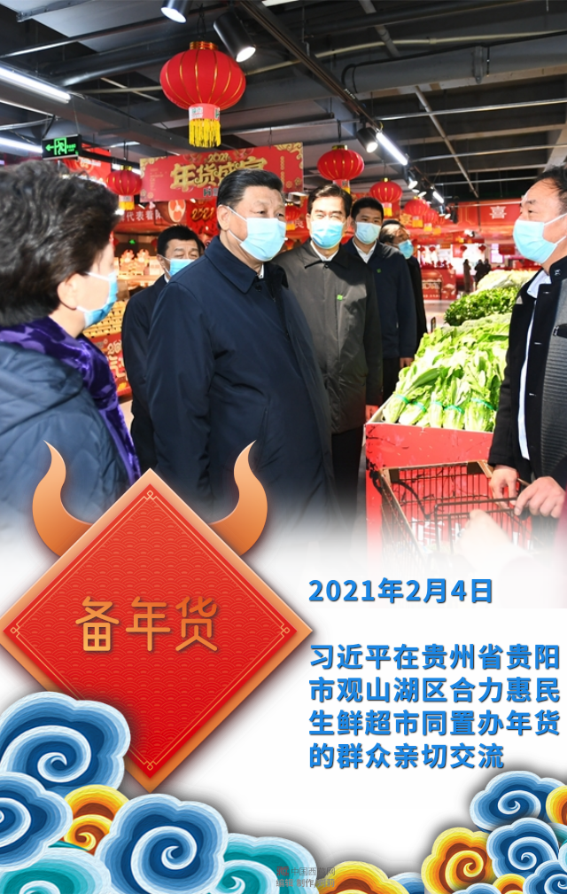 習(xí)近平在貴州省貴陽市觀山湖區(qū)合力惠民生鮮超市同置辦年貨的群眾親切交流
