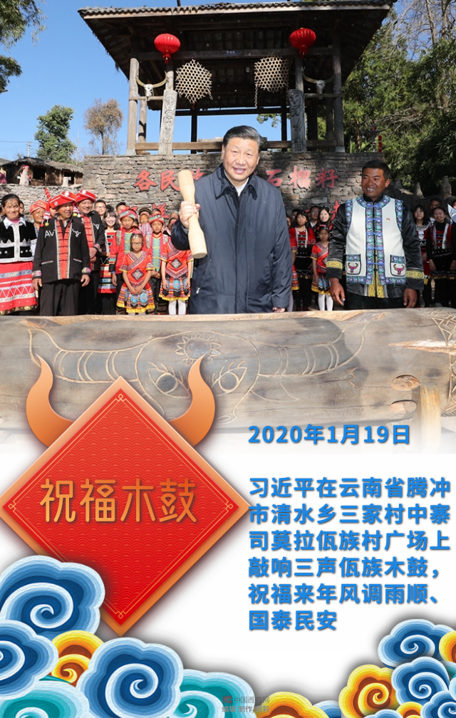 習(xí)近平在云南省騰沖市清水鄉(xiāng)三家村中寨司莫拉佤族村廣場(chǎng)上敲響三聲佤族木鼓,祝福來年風(fēng)調(diào)雨順、國泰民安