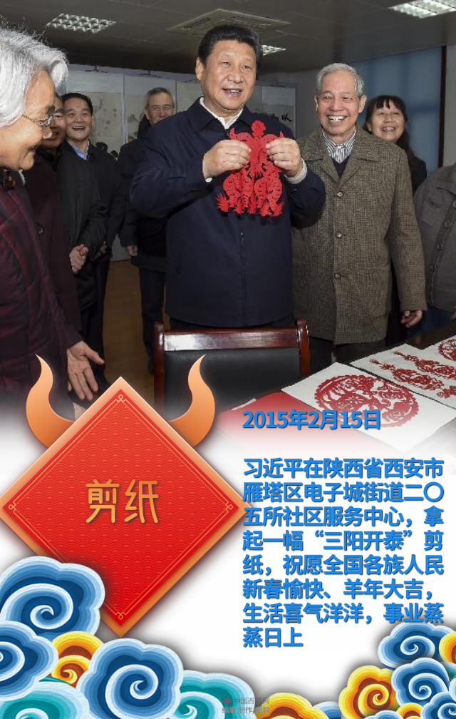 習(xí)近平在陜西省西安市雁塔區(qū)電子城街道二〇五所社區(qū)服務(wù)中心,拿起一幅“三陽開泰”剪紙,祝愿全國各族人民新春愉快、羊年大吉,生活喜氣洋洋,事業(yè)蒸蒸日上