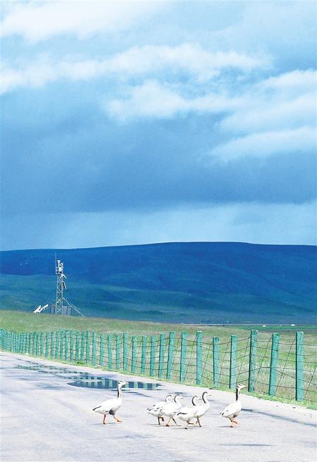 尕海湖畔,大豆雁領著小豆雁悠閑地穿過馬路。
