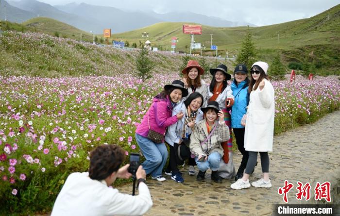 9月9日,四川稻城縣金珠濕地公園一望無際的格?;êf弊湘碳t,過往車輛和游客們紛紛下車,走進濕地公園用手機直播和拍照留念。