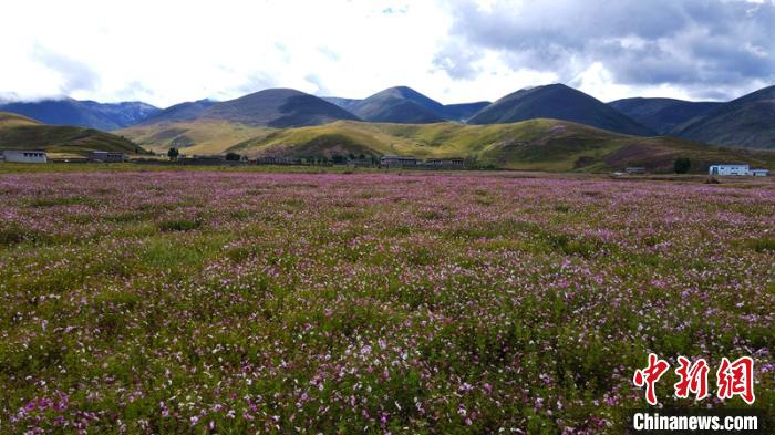 稻城縣噶通鎮(zhèn)八美村位于亞丁機場前往亞丁景區(qū)的交通要道上。長期以來,這片草原沙化現(xiàn)象日益嚴重,當?shù)卮迕褓囈陨娴膫鹘y(tǒng)放牧都難以為繼。2016年以來,稻城縣利用生態(tài)治理工程實施的契機,整合全域旅游和脫貧攻堅等涉農(nóng)涉旅資金,在沙化草原上大面積種植格?;?,將1599畝沙化草地打造成色拉花海。