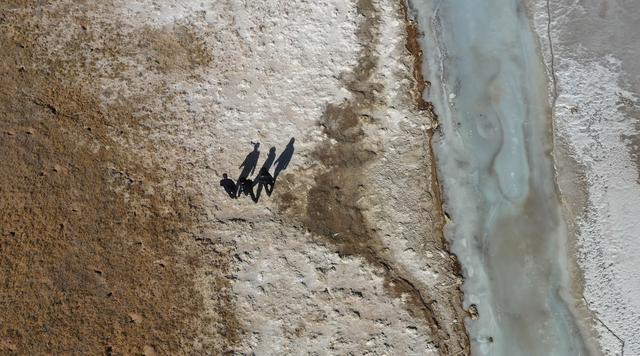 12月7日,站長趙新錄(中)與隊友鄧海平(左)、達才在可可西里索南達杰保護站管護區(qū)域內巡查(無人機照片)。