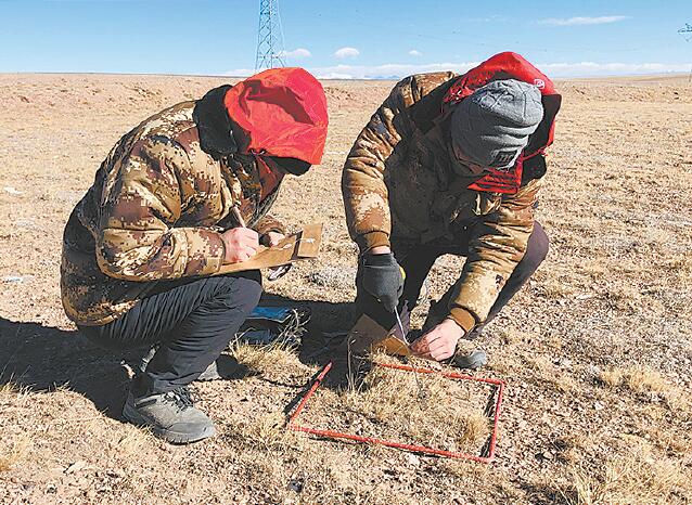 在另一塊平整的草地上,中科院西北高原生物研究所的賀福全和同伴正在采集植被樣本。賀福全說,他們的主要目標是了解這個區(qū)域草的長勢情況,并將植被樣本帶回實驗室進行分析,針對這塊草地的承載能力,測量草地產(chǎn)量,給直升機和無人機做地面驗證工作。